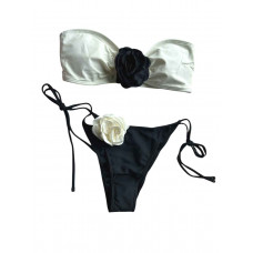 Купальник роздільний кремовий ліф чорні плавки з трояндами M 44